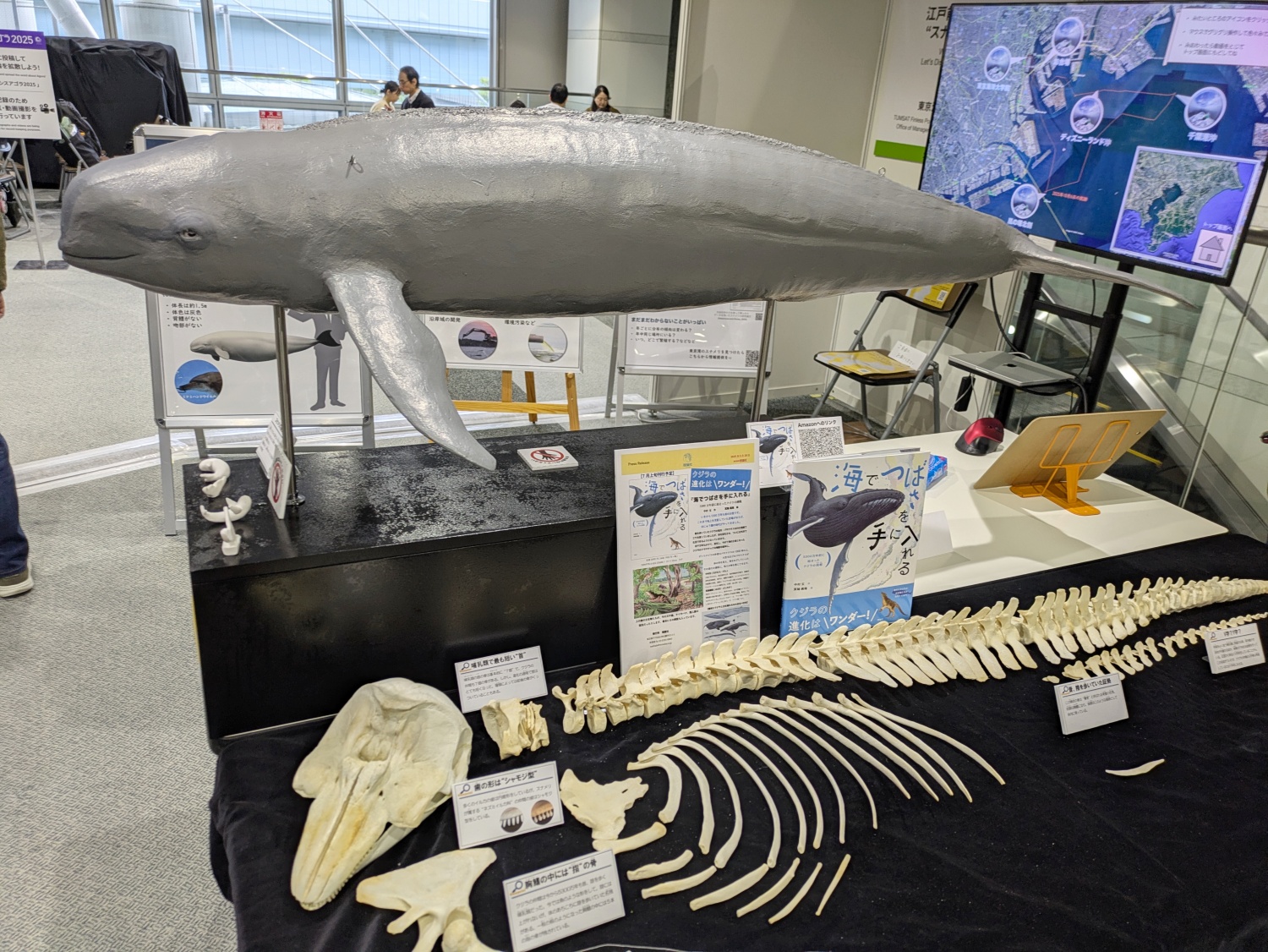サイエンスアゴラは海洋系の発表も充実しています。東京海洋大学の鯨類学研究室では東京湾に生息する小さなクジラ“スナメリ”の生態を調査中。まだ未知の生態であることから、沿岸の住民や釣り人、船舶から目撃情報を募るなど、一般市民の協力によって研究する“市民科学”も展開しています。こんな小さくてかわいいクジラが東京にいるんですね。