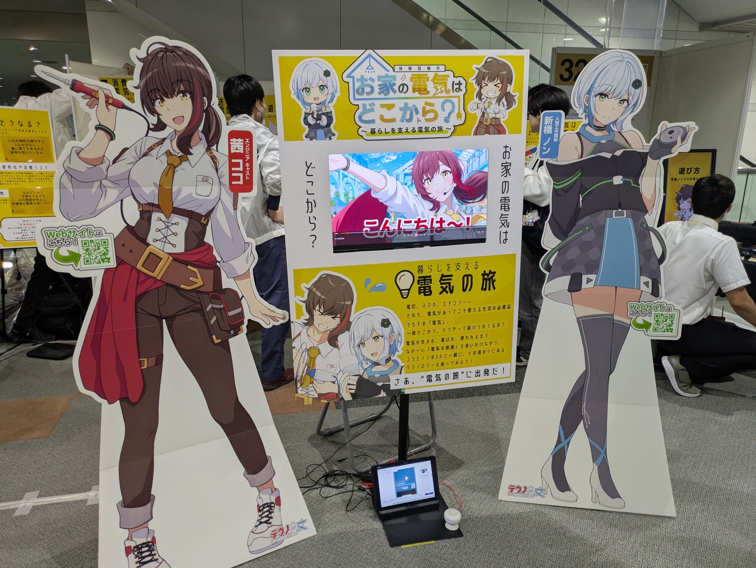 身近な身の回りのモノにまつわるテクノロジーについてキャラクター達と一緒に学べるメディアミックスコンテンツ「テクノ少女」。今回、茜ココと新橋ノンの二人がナビゲートしてくれるのは“電気”。発電の方法から家庭に電気が届くまでの仕組みや技術について解説してくれます。人力発電チャレンジも盛り上がっていました。