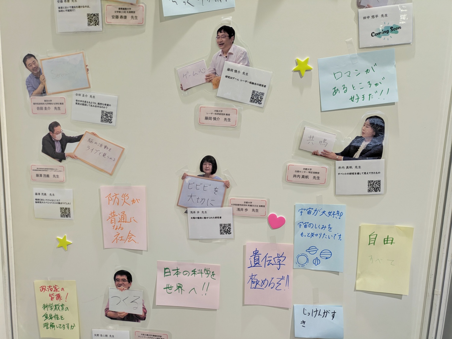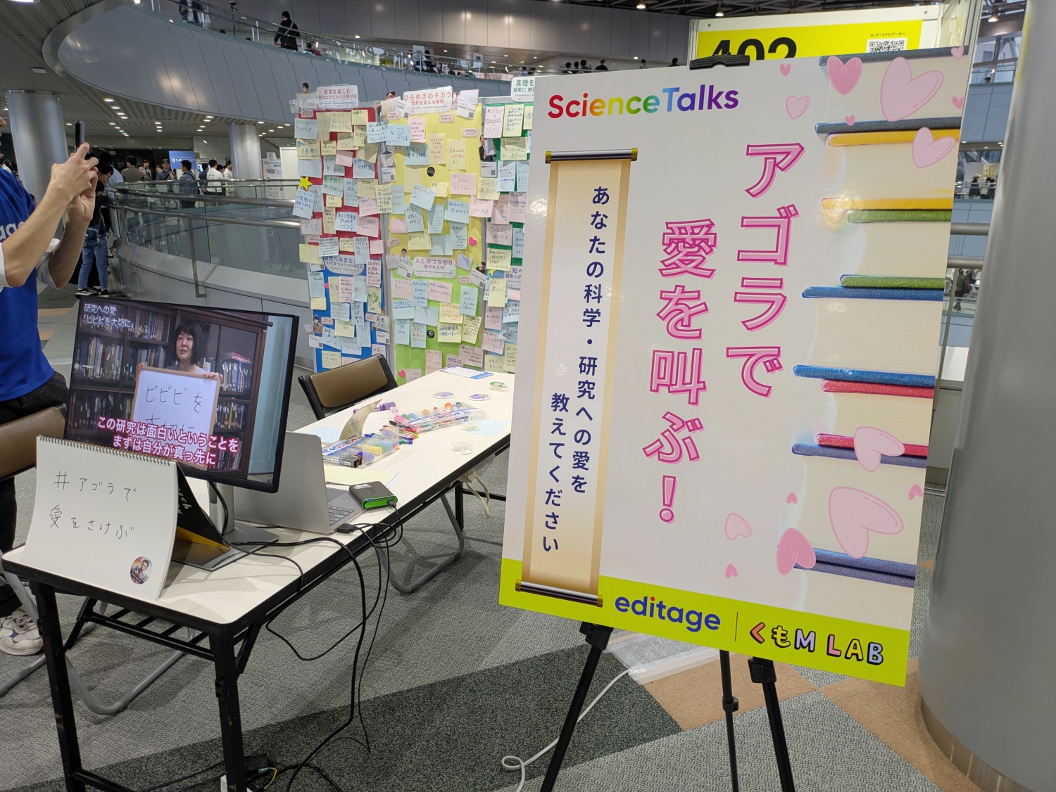 サイエンスアゴラの会場の中心でを叫ぶブースが登場。科学に携わる研究者の動画を公開しているほか、来場者が科学・研究への思い、好きになったきっかけや目標などなどメッセージを貼りつけたりできるコミュニケーションの場です。誰かが書いた「政治家の皆様!科学教育の重要性を理解してますか」というポストイットが気になりました。