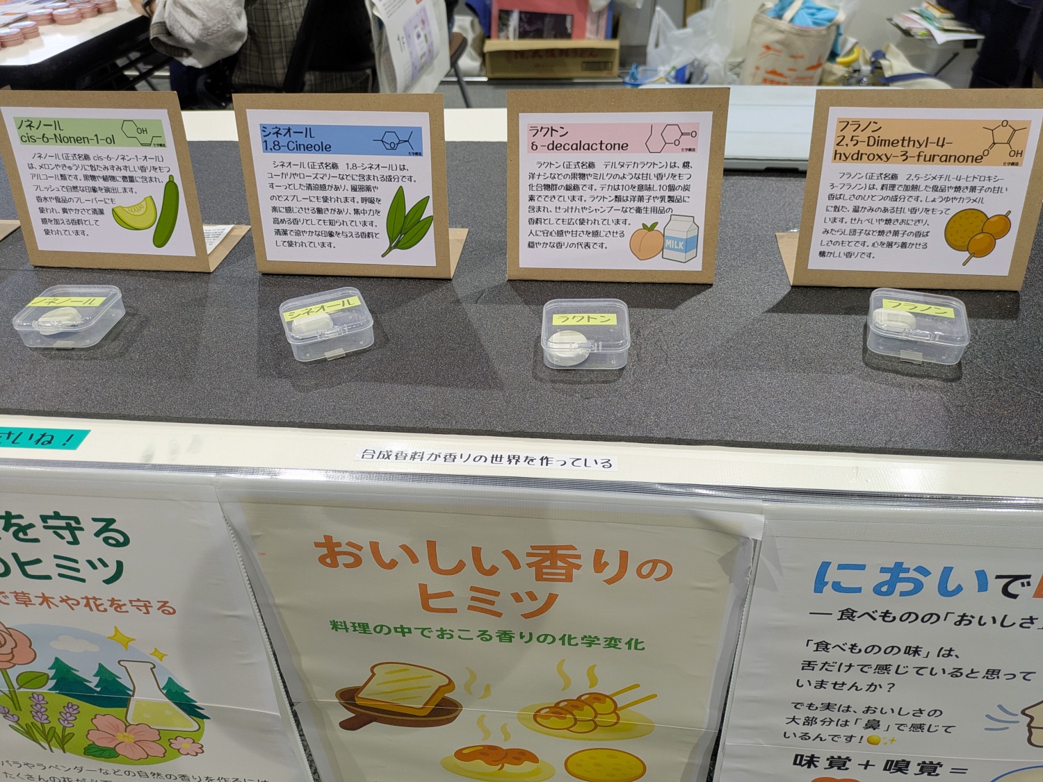 天然のエッセンシャルオイルと、それらを模倣した合成香料をクイズ形式で嗅ぎ比べ体験ができるコーナー。「どちらが天然の香料か」を当てる体験を通じて、合成香料と天然香料の違いや共通点に気づき、合成香料に対する誤解や不安を解消することを狙いとしています。美味しさを感じるのは実は味覚だけでなく嗅覚も重要だ、という情報も。