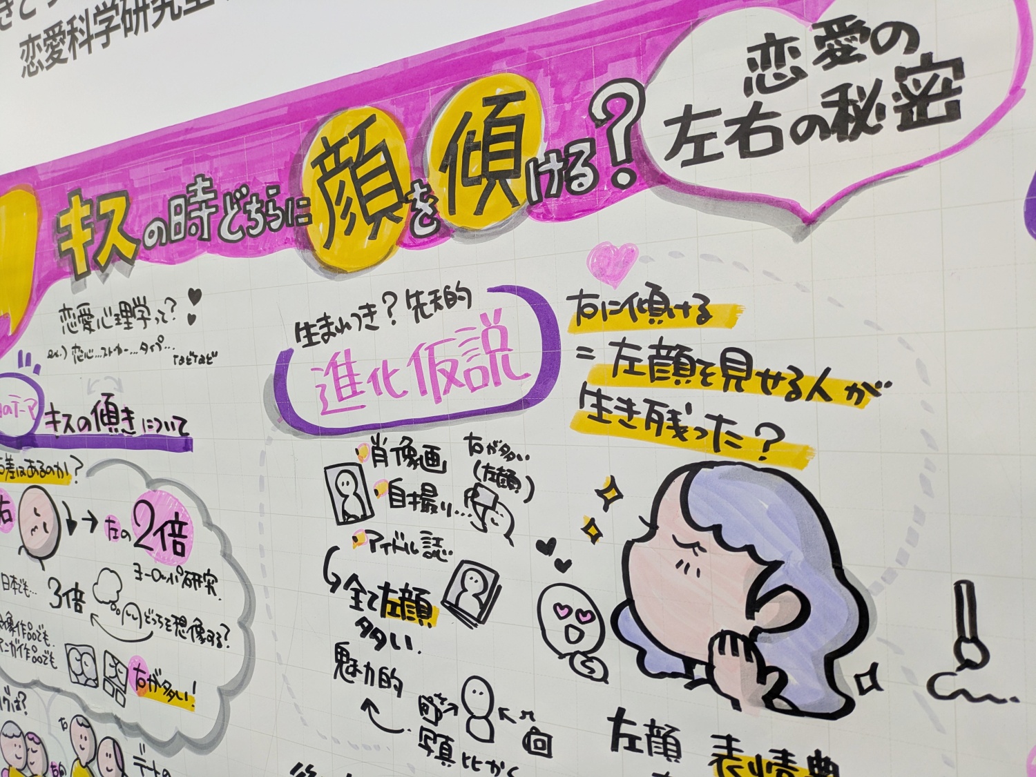 このトークイベントを見られなかったのですが、グラフィックレコーディングが残されていました。「キスやハグ、デートの立ち位置といった恋愛行動における左右の行動パターンを日本の研究だけでなく海外の研究も交えて紹介します。また、映像作品や歌詞、漫画など文化や時代が恋愛行動に与える影響を分析します。さらに、キスの方向性に関する仮説(利き手、運動、感情)を検証し、文字の読み書きの向きや左顔の魅力といった要因を実験や分析を通じて考察します。」(概要より) 経験上、私も含めて右に傾ける人が多い気がしますが、皆さんはいかがですか?