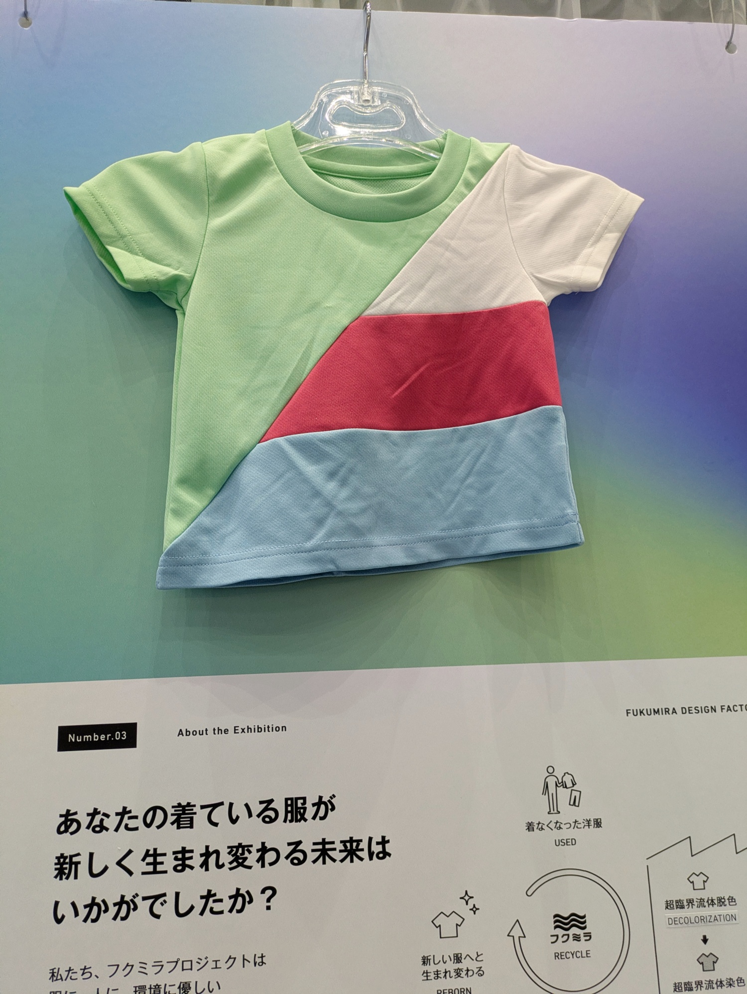 服の生産には大量の水やエネルギーが使われており、また世界で1年間に捨てられてしまう衣類の量は9,200万トンにものぼるなど、服の廃棄も地球環境にとって大きな問題になっています。そこで、水の代わりに二酸化炭素を使って繊維を染めたり脱色したりできる“超臨界流体技術”が、課題解決につながるという提案。すでに実用化されている染色サンプルのほか、大阪・関西万博でも人気だったAI画像でファッションが変わるアプリケーションも楽しいブースでした。筆者の地味な服もクールなファッションに画像変換。