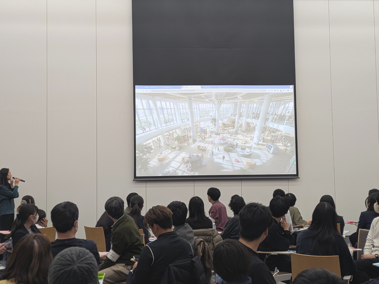 後半ではどんな町づくり、空間ができると幸せで生き生きとした暮らしができるかを小グループで話し合い、そこで出たアイデアを生成AIで画像化する試みが行われました。