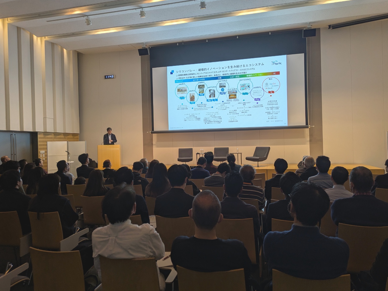 アイパークインスティチュート株式会社の木谷英太取締役の講演では、三菱商事のボストン支店長としての赴任経験を基に、イノベーションを生む環境について「多様なプレイヤーが連携し、新しい価値を提供する事業を創出して育成し、新陳代謝を繰り返しながら持続的に企業を育てる仕組み」が必要であると述べました。