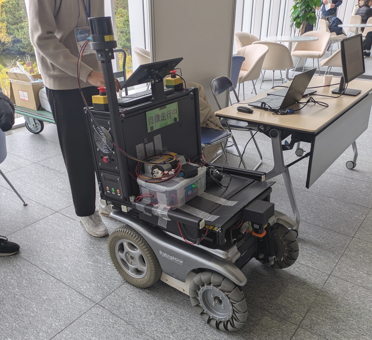 昨年も出展していた横浜国立大学藤本研究室の開発している電動車いす型自律移動ロボットも、さらに性能が向上してテスト走行を行っていました。