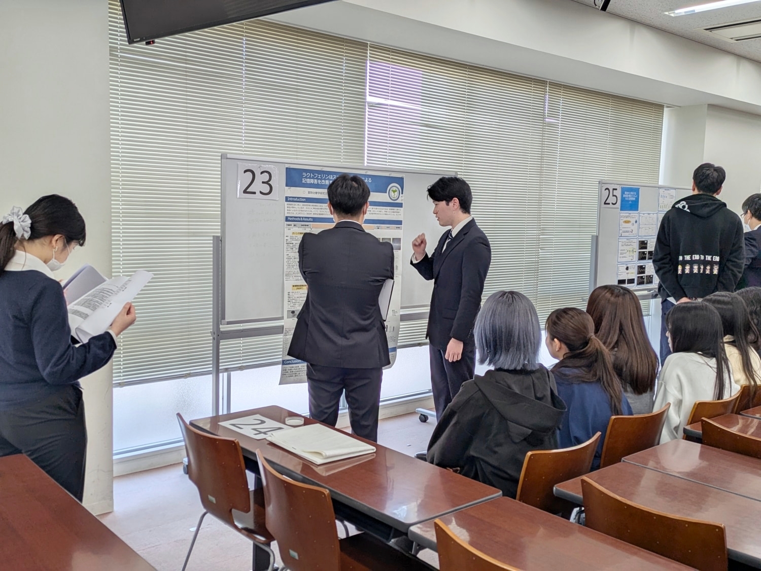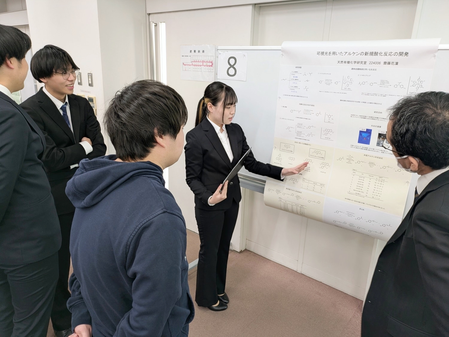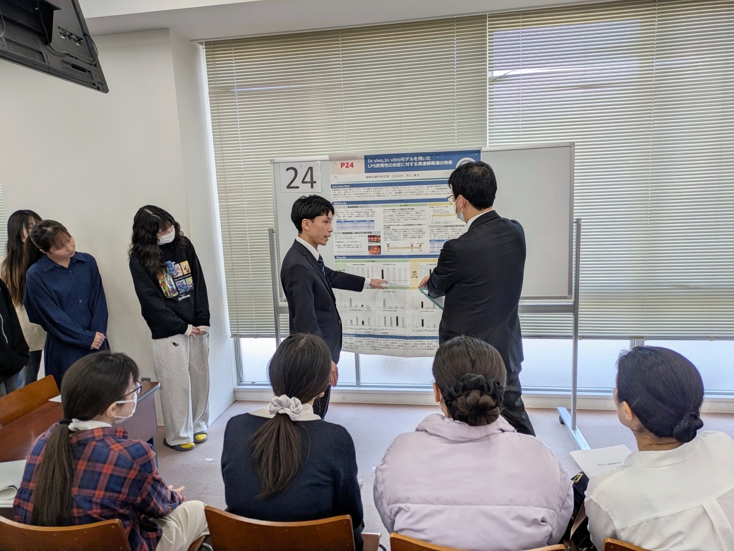 薬科学科生の研究内容は所属する研究室の専門性に伴い、範囲も幅広い。創薬科学/天然有機化学/分子生物学/臨床解析学/機能性物質学/放射線科学/薬物治療学/環境科学/生薬学/漢方治療学/漢方天然物化学/漢方薬物学・・・といった多様な分野の研究が取り組まれている。発表会では4年間の学びと研究成果の集大成として、全35名がポスター発表形式でプレゼンテーションを繰り広げた。