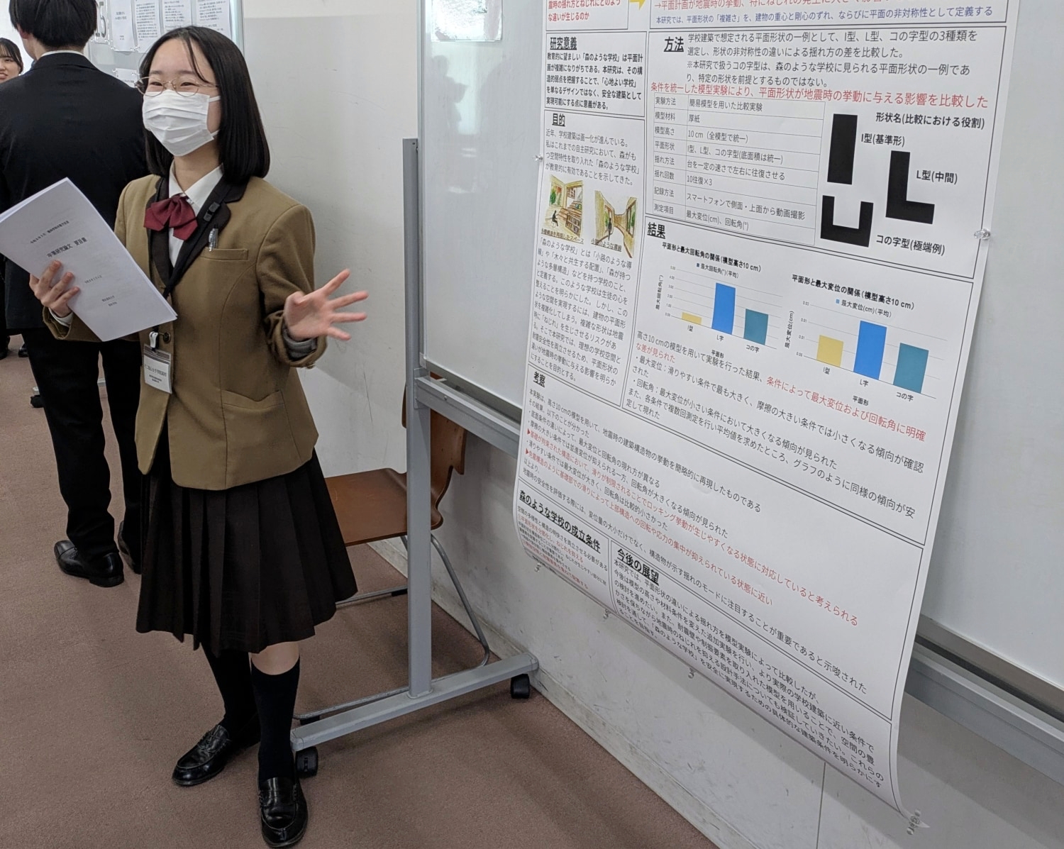 発表会では毎年、学びのコラボレーションとして高校生の研究発表会も同時開催される。今年はゲストとして不二聖心女子学院高等学校(静岡県裾野市)から、2年生の近藤由野さんが参加。『学校建築の平面形状が地震時の揺れ・ねじれに与える影響―模型実験による比較―』と題した発表を行なった。教育環境に自然を取り入れる「森のような学校」の空間づくりを研究するうえで、建築における耐震性について実験・考察した内容で、薬学とは異分野でありながら、薬学部教員や学生とのディスカッションも充実した一幕となった。
